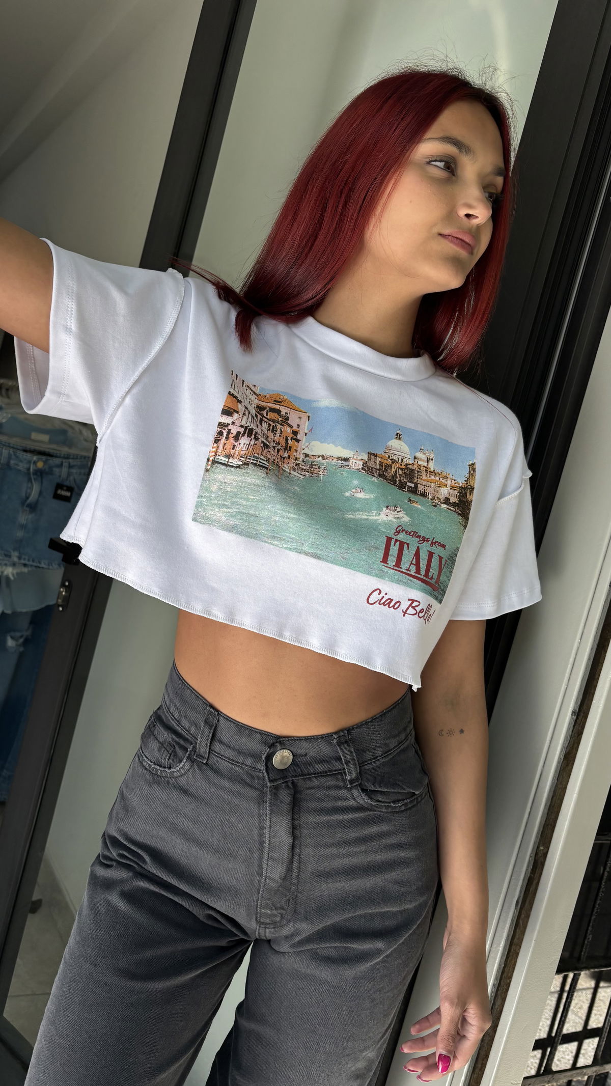 ¡Dale un toque trendy a tu look! Esta remera crop de algodón tiene una estampita inspirada en Italia que le da estilo y personalidad. Perfecta para combinar con tus jeans, faldas o shorts favoritos.