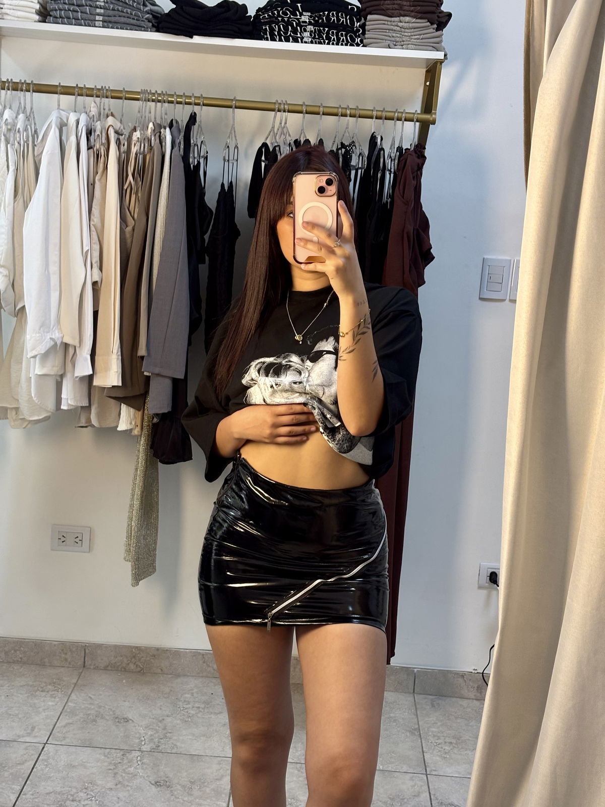 Brilla y destaca en cualquier look con esta pollera de charol, moderna y súper versátil. Perfecta para combinar con tops básicos o prendas más elegantes, y lograr outfits con actitud y estilo.