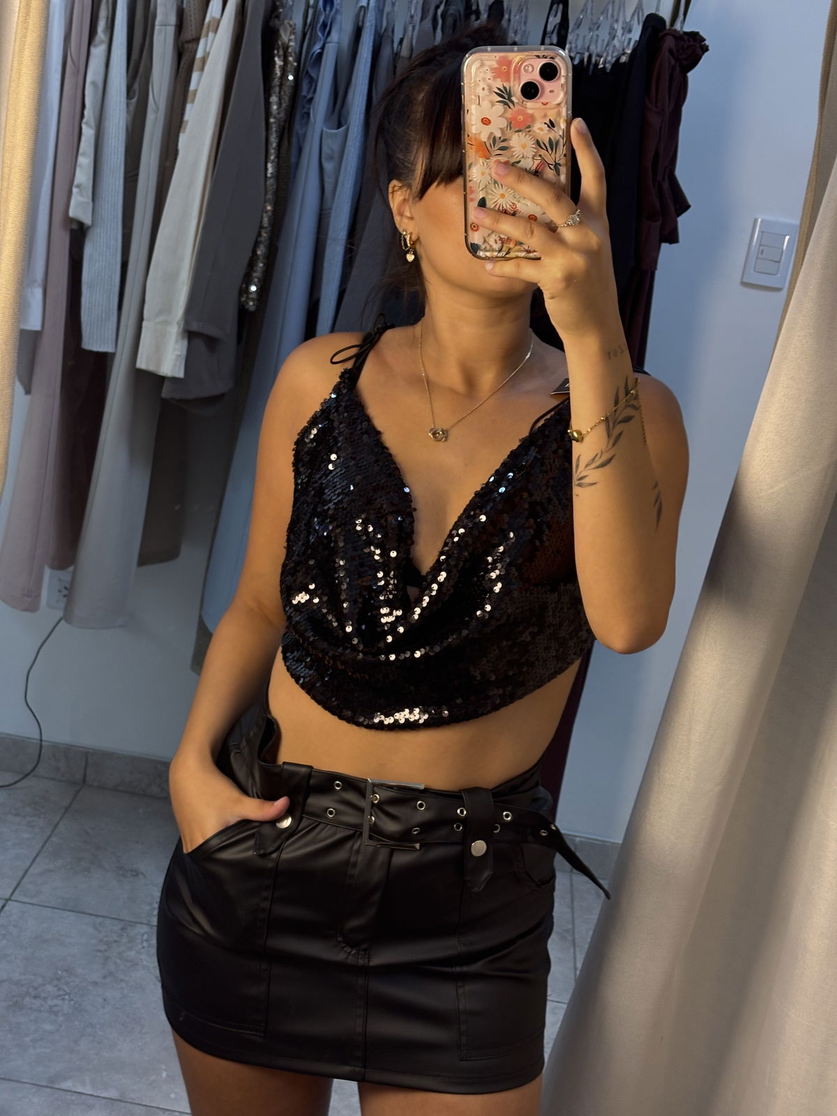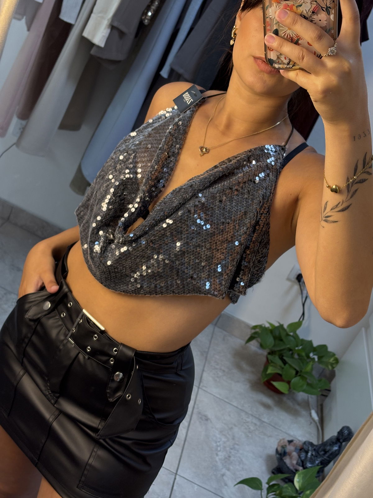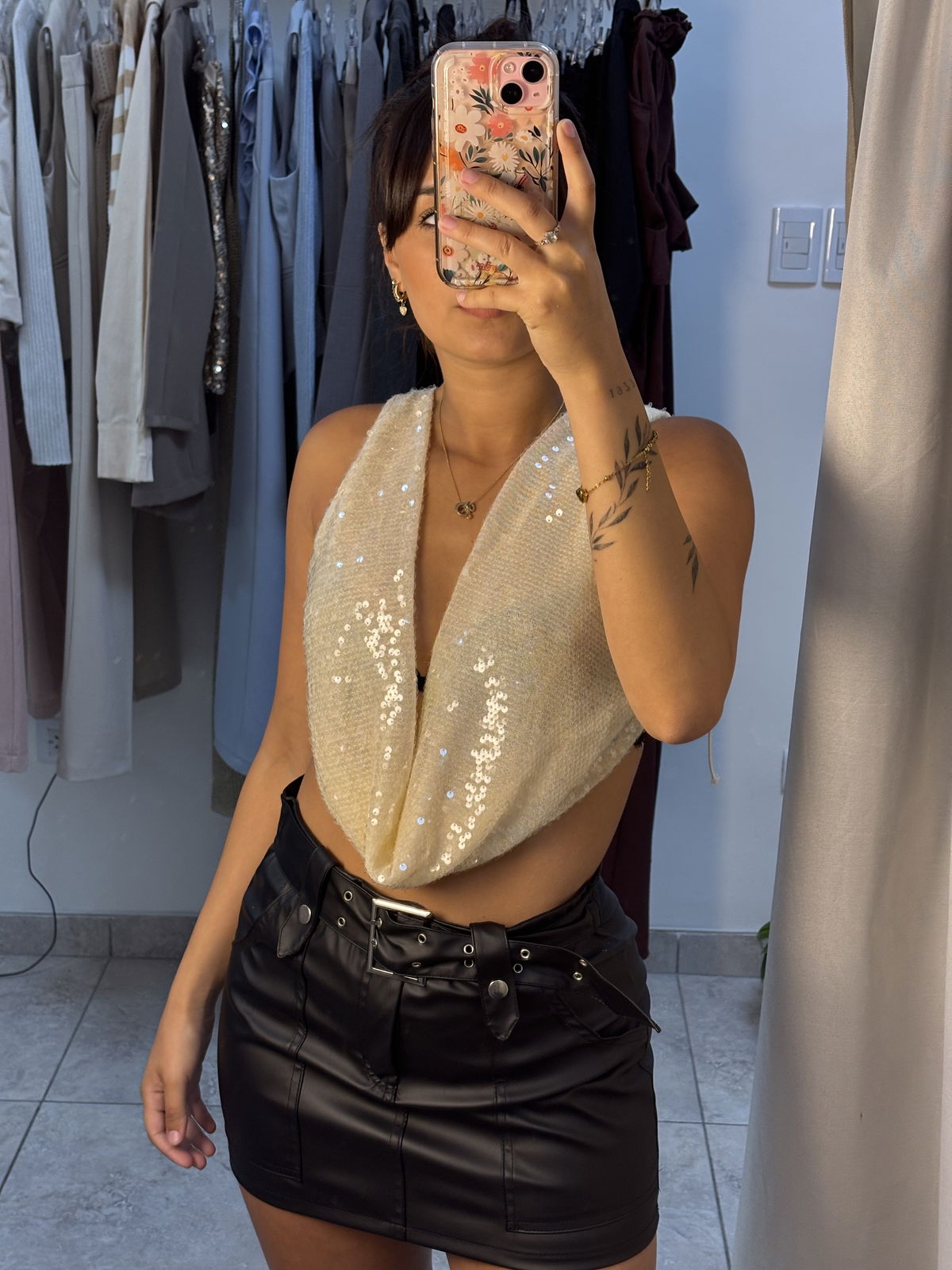Top con buche y escote de lentejuelas, espalda descubierta. Brillante, femenino y perfecto para looks de noche. pensado para quienes buscan una prenda impactante. La espalda descubierta aporta un toque sensual