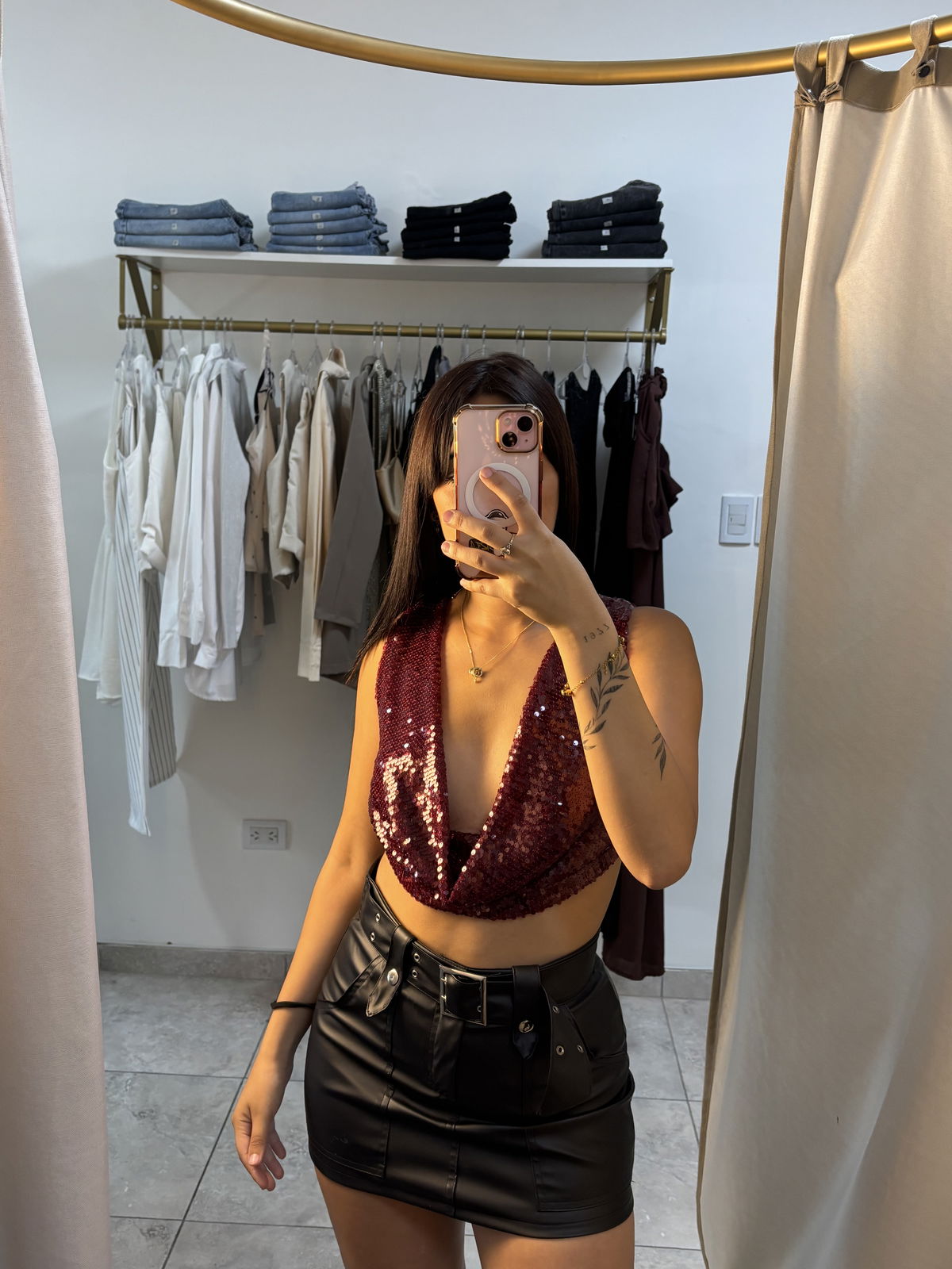 Top con buche y escote de lentejuelas, espalda descubierta. Brillante, femenino y perfecto para looks de noche. pensado para quienes buscan una prenda impactante. La espalda descubierta aporta un toque sensual