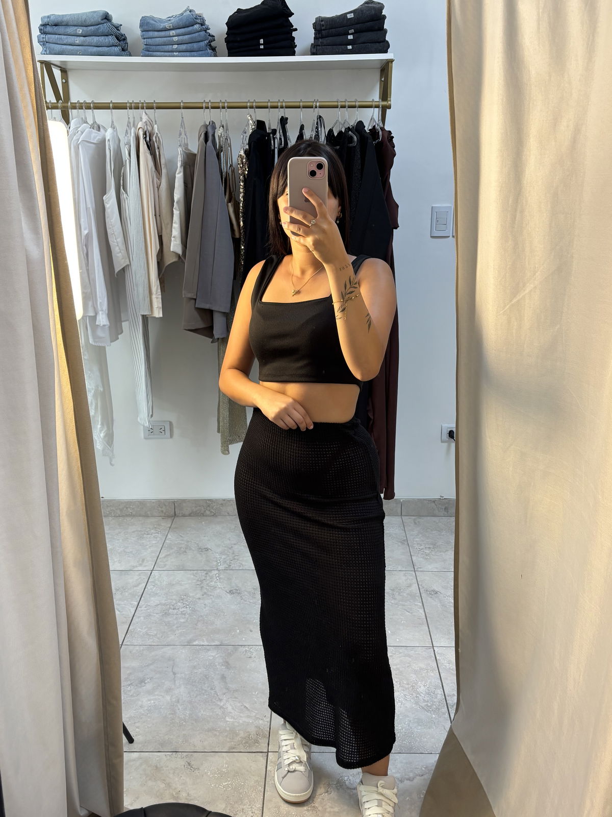 Una pollera tejida que se adapta increíble al cuerpo. Su tejido elástico acompaña las curvas sin ajustar de más, ideal para usar con tops, remeras básicas o camisas oversize. Es liviana, canchera y súper combinable para cualquier temporada.