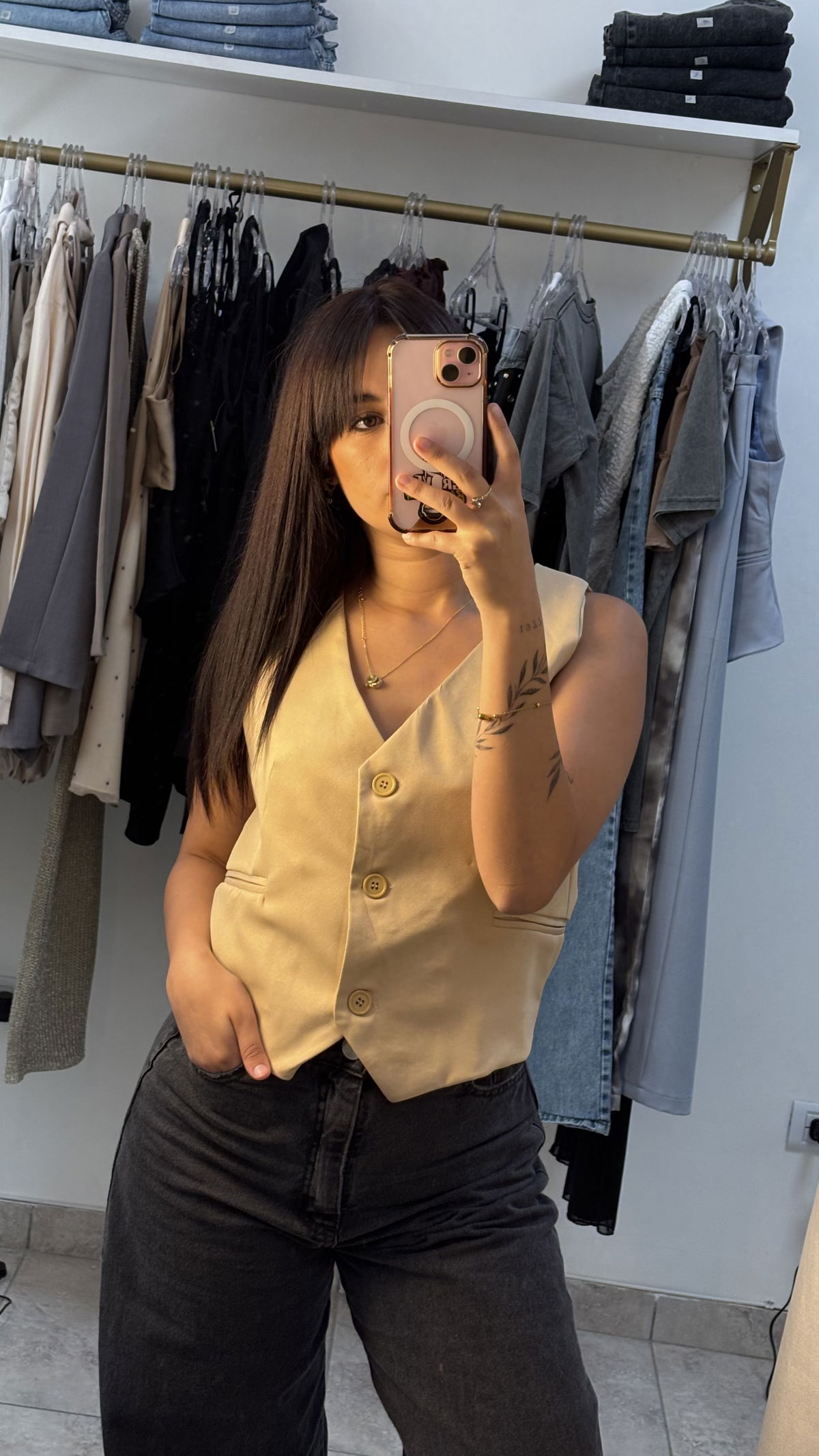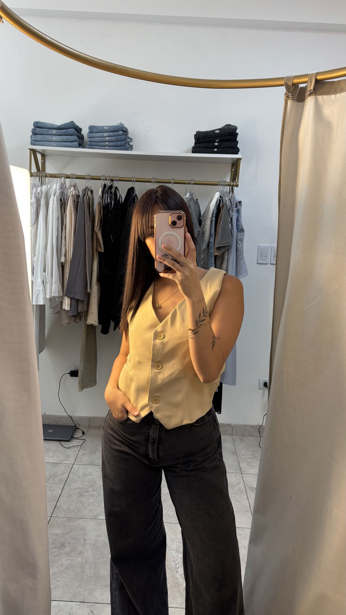 Un chaleco sastrero súper prolijo y canchero, ideal para usar solo, con tops o arriba de camisas. Está forrado por dentro, lo que le da mejor estructura y un calce impecable. Es ese básico elegante que queda bien con jeans, pantalones sastreros o shorts para un look más relajado.