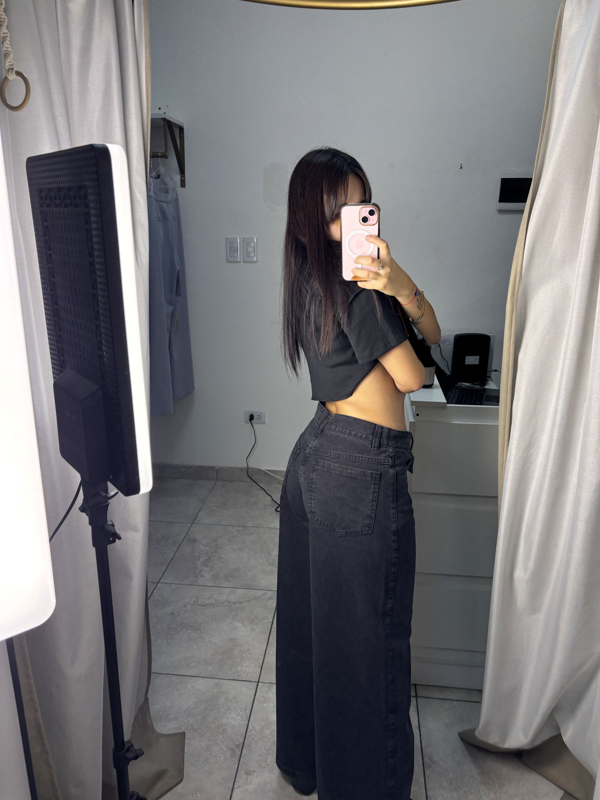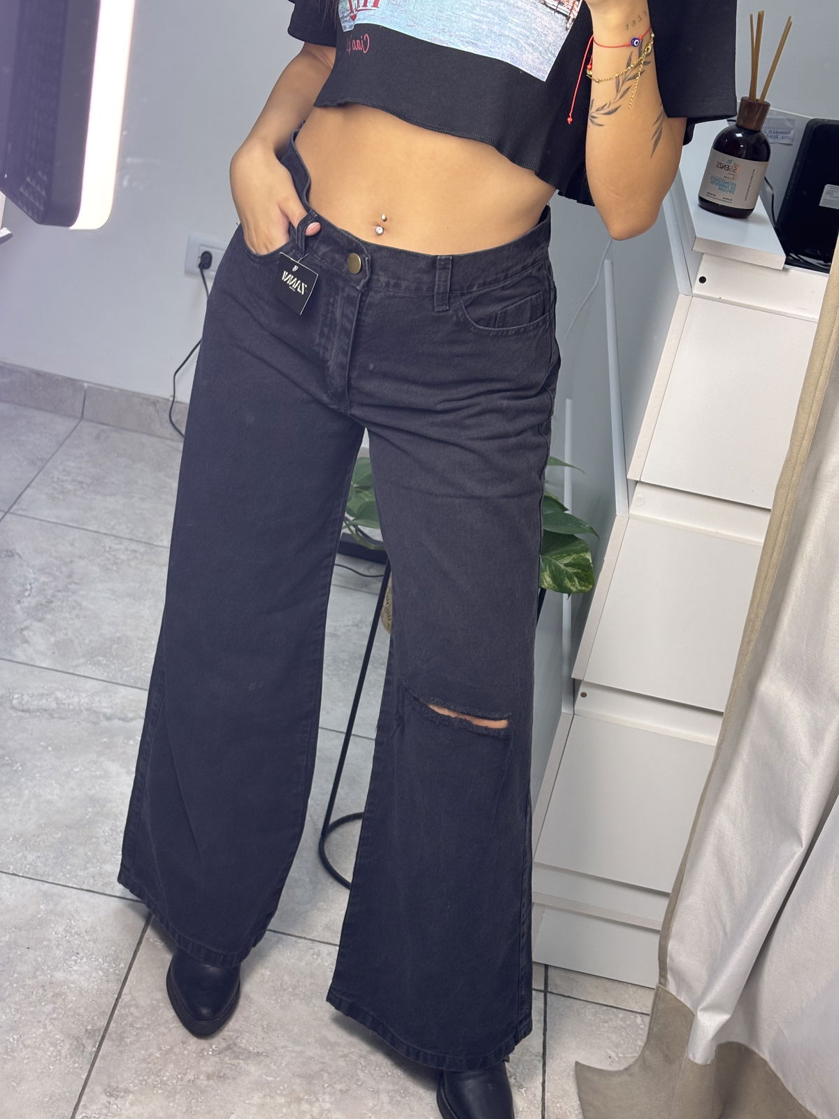 Jean de denim rígido wide leg, tiro medioy. Presenta detalle de rotura en la rodilla, que le aporta un estilo moderno y canchero.